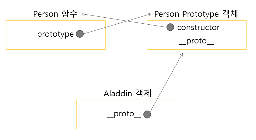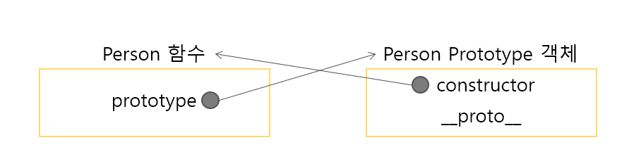 먼저 Person 함수에는 prototype이라는 속성이 있다. 이 속성은 Person Prototype 객체를 가리키고 있기 때문에 이를 통해 객체에 접근이 가능하다. 역으로 Person Prototype 객체 안의 constructor에서는 생성되었던 함수인 Person 함수를 가리키고 있다.