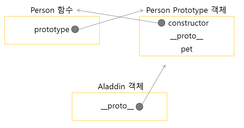 먼저 Aladdin.pet을 호출하였을 때, Aladdin에는 pet이라는 속성이 없다. 그래서 Aladdin 객체 안의 __proto__가 가리키고 있는 Person prototype 객체로 올라가 여기서 pet이라는 속성을 찾는다. 그리고 여기서 찾은 pet의 값을 반환하게 되는 것이다.
