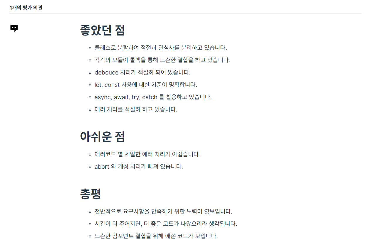 무엇보다 이 데브매칭 과제테스트에서 제일 좋았던 점은.. 바로 시니어 개발자분들이 소스 코드를 보면서 코드 리뷰를 달아주신다는 점이다. 덕분에 내가 어떤걸 잘했고 못했는지 확인하고 앞으로 어떻게 발전해야 할 지 알 수 있었다.